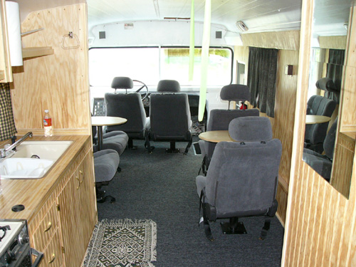Here is a shot of the two seats directly behind the driver. They are in the "lounge position" for stationary use. Each of the seats has it's own set of seat belts for over the road use. The table is removable for comfort when not needed and stores under the sink. The Toyota seats are very comfortable. BTW - THEY DO PASS the forty winks test.....