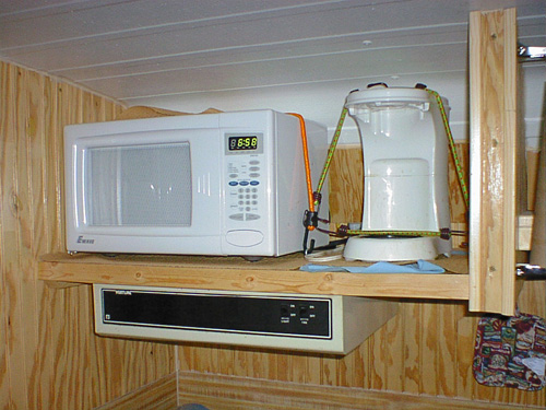 Here's how we secure the microwave and the coffee pot. The extra bungie holds the pot in the coffemaker while going down the road. I don't drive with coffee in the pot. We make coffee while parked, then transfer into big cups if we are going to move and secure everything down after it cools.